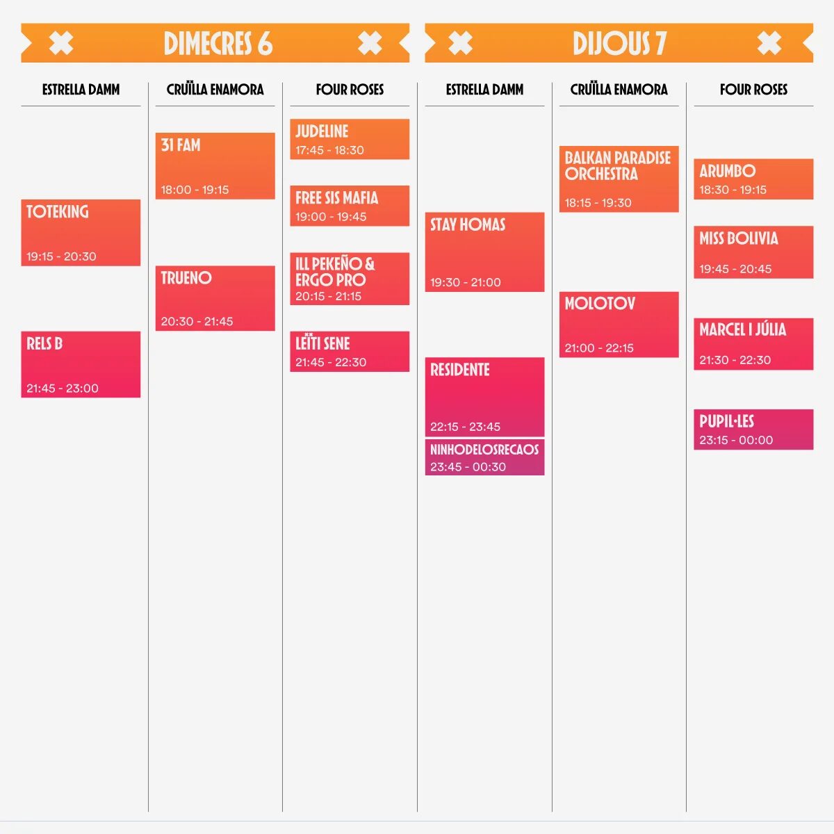 Regresan los cinco escenarios del Cruïlla. El principal, como de costumbre será el de Estrella Damm, por donde desfilarán algunos de los principales artistas de esta edición como Duran Duran, Jack White o Residente. Por su lado, el escenario Cruïlla Enamora lo complementará con actuaciones como las de Rigoberta Bandini, Molotov o Rozalén, entre otros.