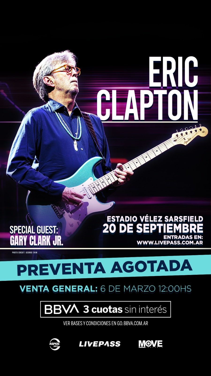 Eric Clapton cumple 60 años de carrera y, para celebrarlo, regresa a los escenarios en su nueva gira mundial que comienza el 9 de mayo en Newcastle, Inglaterra, y que ya tiene fechas para llegar a Argentina: el show se realizará el 20 de septiembre, en el estadio José Amalfitani de Buenos Aires, Argentina. El esperado show también contará con un Opening estelar del cantante y guitarrista ganador del Grammy Gary Clark Jr.
