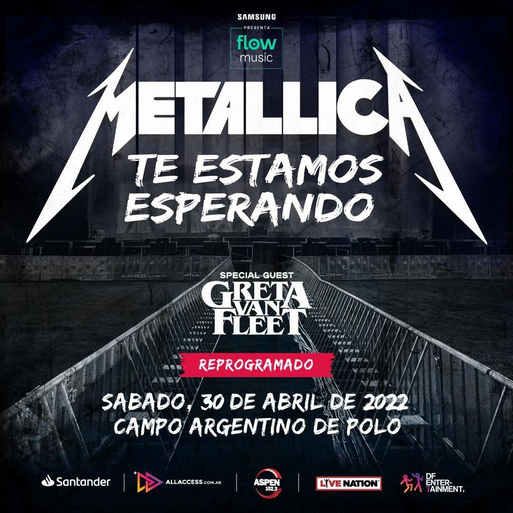 Metallica, la legendaria banda liderada por James Hetfield, ha reprogramado su show en Argentina para el 30 de abril de 2022 en el Campo Argentino de Polo con Greta Van Fleet como banda invitada. Presentado por Flow Music y producido por DF Entertainment.